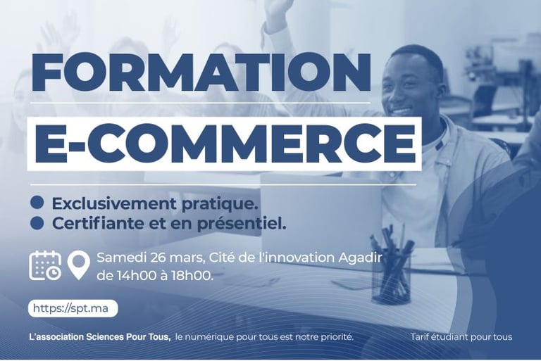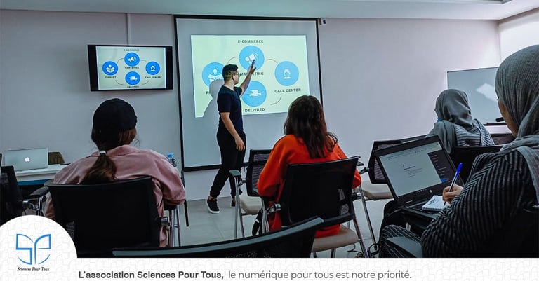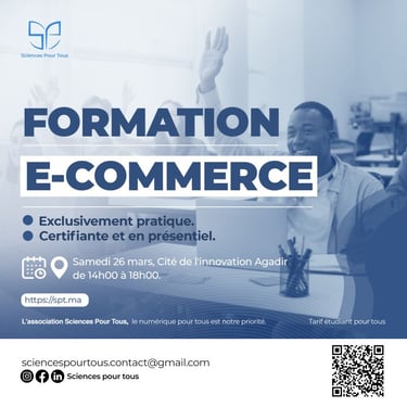 L’Association Sciences Pout Tous a organisé une formation E-commerce & Marketing Digital certifiantes. Elle a été animée par un expert dans le domaine Monsieur YOUNES LRHAZI, le 26 mars 2022 à la Cité de l’Innovation d'Agadir.