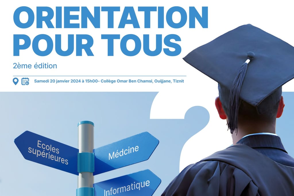 Nous sommes heureux de vous présenter notre deuxième édition de l'événement "Orientation Pour Tous", organisée en partenariat avec les associations Ichraqat Amal et AFOULKI pour le développement et la coopération, Id Abdelkader Ouijjane. L'événement s'est tenu le samedi 20 janvier 2024 à 15h00, au Collège Omar Ben Chamsi à Ouijjane, Tiznit.