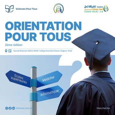 La mission "Sciences pour tous" à travers l'événement "Orientation pour tous" vise à rendre l'information sur l'orientation et les disciplines existantes pour les différents profils. L'orientation doit être accessible à un large public et à offrir les ressources nécessaires surtout les enfants des villages de la région de Souss.