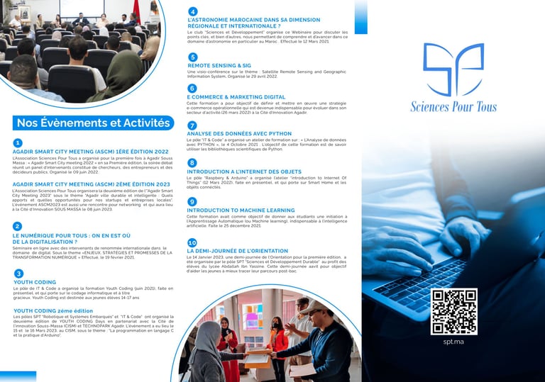 Aussi faire de l'animation Scientifique et surtout informatique au niveau de la région Souss Massa Daraa par l'organisation des séminaires, des formations, des ateliers et des rencontres comme Agadir Smart City Meeting.