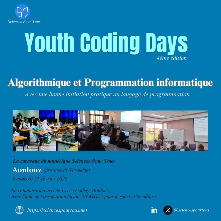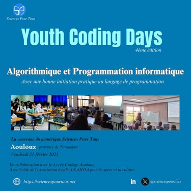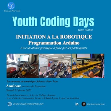 La Caravane du Numérique "Sciences pour Tous" arrive, le 21 et le 22 février 2025, à Aoulouz et dans les villages environnants pour offrir aux jeunes et aux adultes une immersion dans le monde des technologies numériques. À travers nos ateliers interactifs sur l’informatique, la programmation et la robotique, cette initiative vise à réduire la fracture numérique et à éveiller la curiosité scientifique. Grâce à des démonstrations pratiques et l’accès à du matériel innovant, les participants pourront découvrir de nouvelles compétences essentielles pour l’avenir.